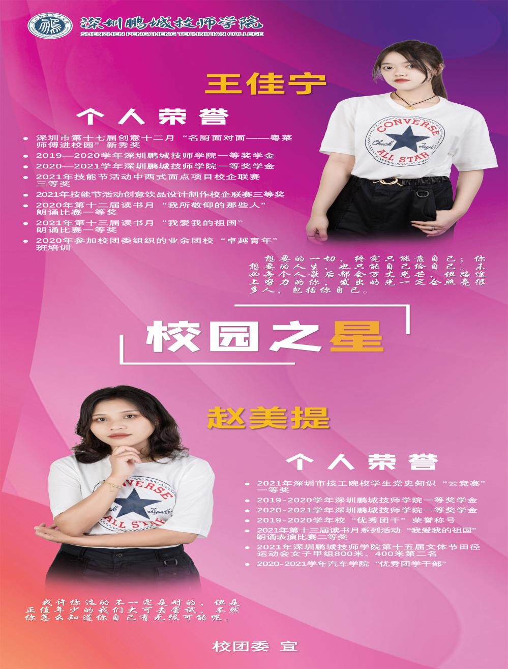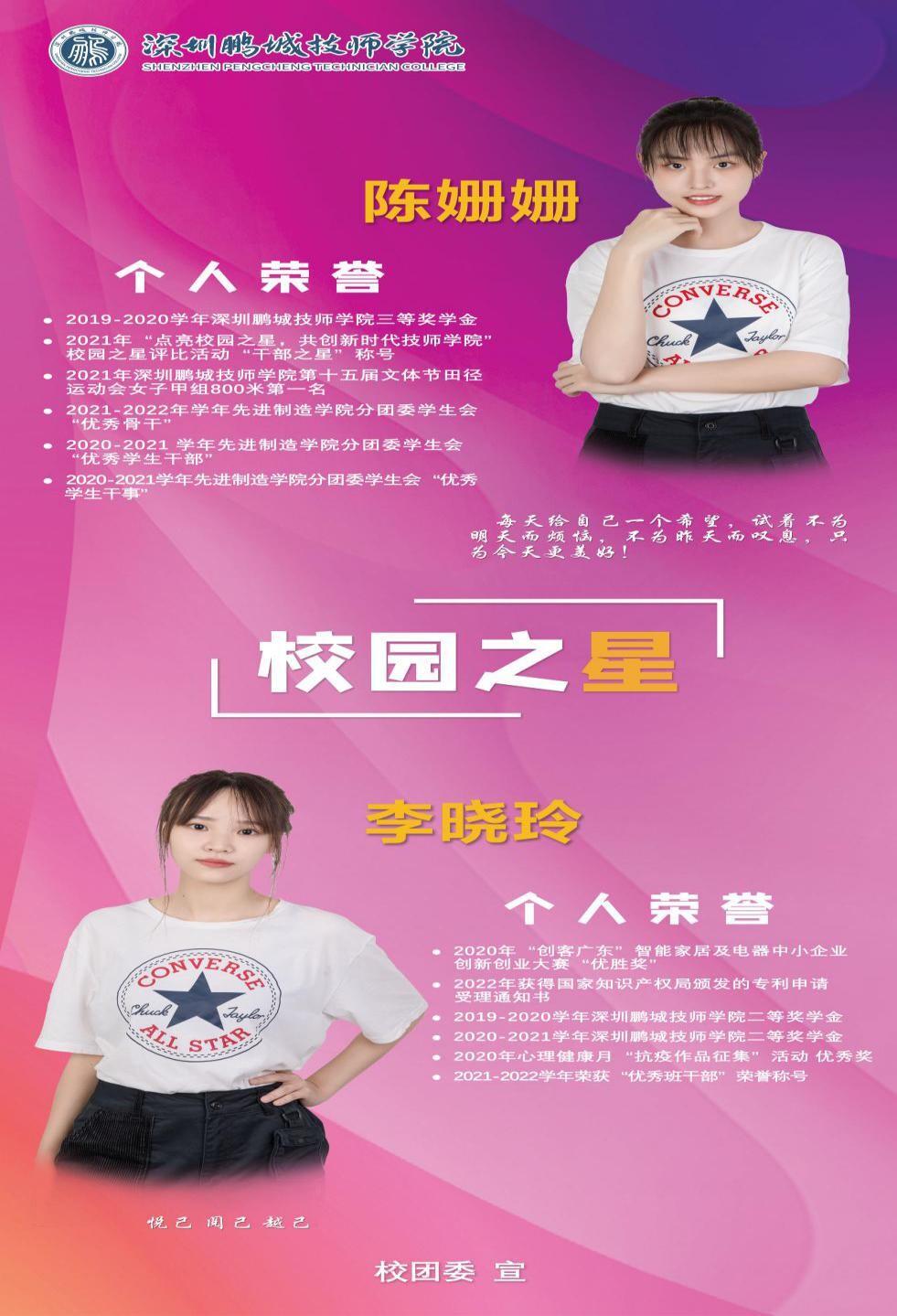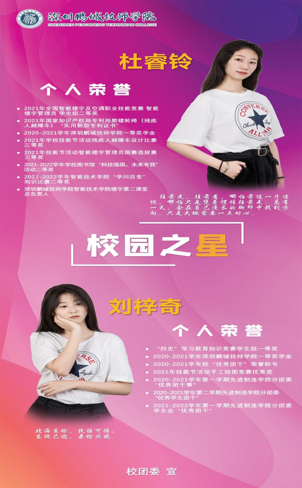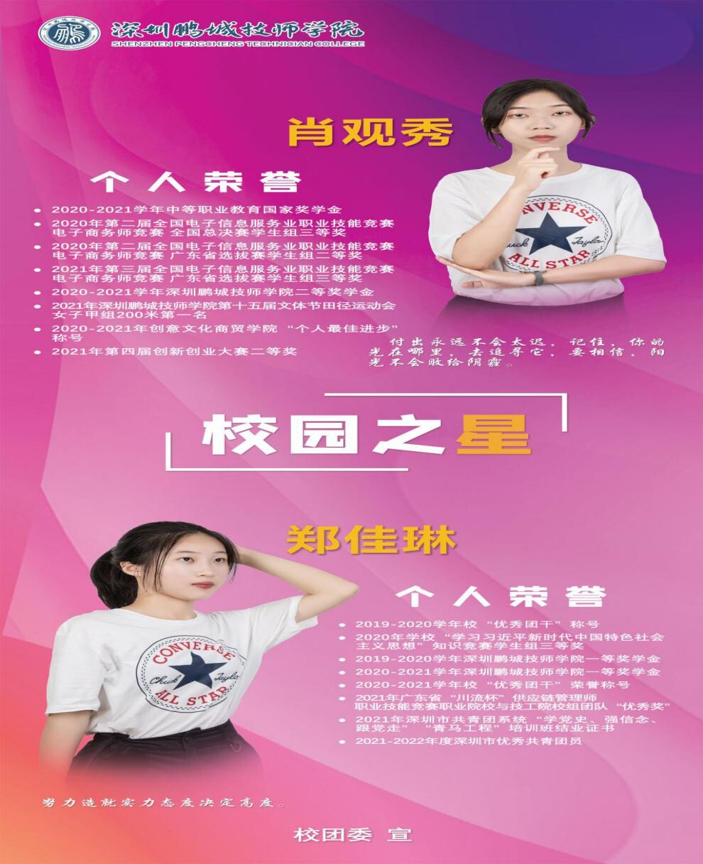 因受新冠疫情影响,本次校内评选采用“线上展示+线下评选”模式开展,各学院分别选出2名教师代表及5名学生代表组成评委会。参加评选的同学们自信从容,按照抽签顺序分别从校园学习情况、个人优势、兴趣特长、荣誉展示、社会实践等方面多角度展现个人风采,最终杜睿铃等10位同学荣获2022年深圳鹏城技师学院“校园之星”称号。其中,杜睿铃、刘梓奇、简千皓3名同学因表现特别优异,作为学校代表被推荐参加并获评广东省技工院校“校园之星”荣誉称号。