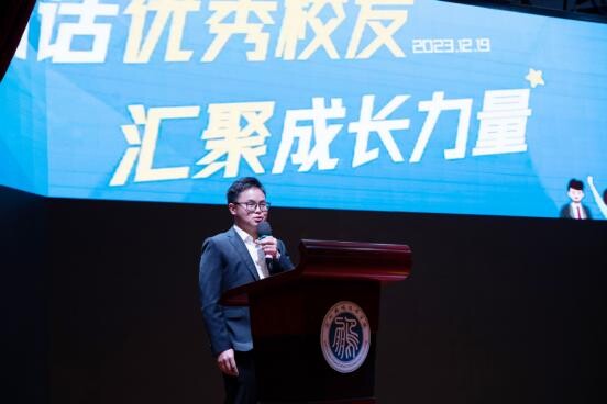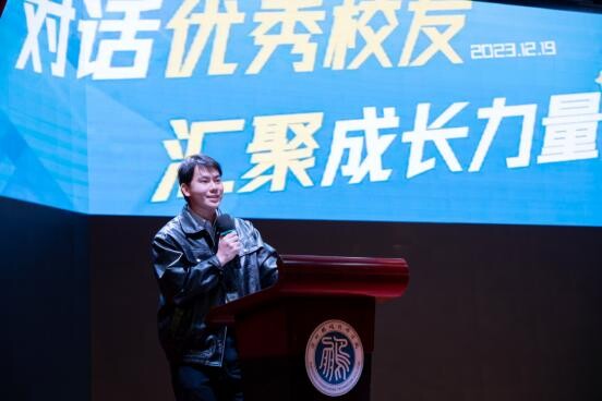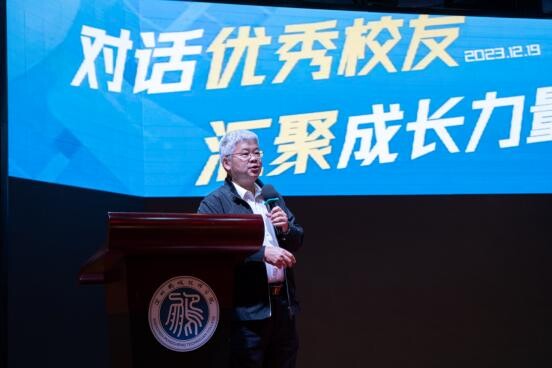 “各位校友就业创业经历以及精彩的分享,让我们看到了国际化的视野和流利的英文表达。我亦借此机会从每位校友的名字中取字,给大家送上祝福和寄语。一是“林艺”取“艺”,“Solid sikll”,要在学校学有一技之长才能走向社会;二是“温新宇”取“新”,“New knowledge”,要向董宇辉学习,读很多书,用新知识去铺垫自己的人生道路;三是“赖晨”取“晨”,“Active thinking”,保持激情与活力,积极思考未来发展;四是“吴虎军”取“虎”,“Powerful team”,组建有战斗力的团队,支持企业发展致远;五是“颜芹”取“勤(芹)”,“Diligent work”,勤奋努力工作,不断拓宽自己的知识面。