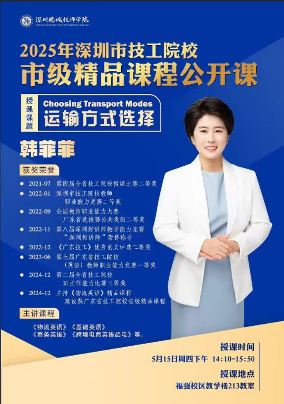 据悉,《物流英语》课程由我校创意文化商贸学院韩菲菲老师主持开发,先后获评2024年深圳市技工院校市级精品课程、2024年广东省技工院校省级精品课程双项殊荣。此次公开课由韩菲菲老师主讲,课堂以“科技赋能、思政育人”为驱动,其中AI深度融合、小组辩论等四大亮点更是引燃爆课堂亮点,让学生在“玩中学、做中学”,解锁物流英语沟通硬技能的同时,更将“一带一路”思政元素融入课堂,点燃学子爱国热情和职业使命感。