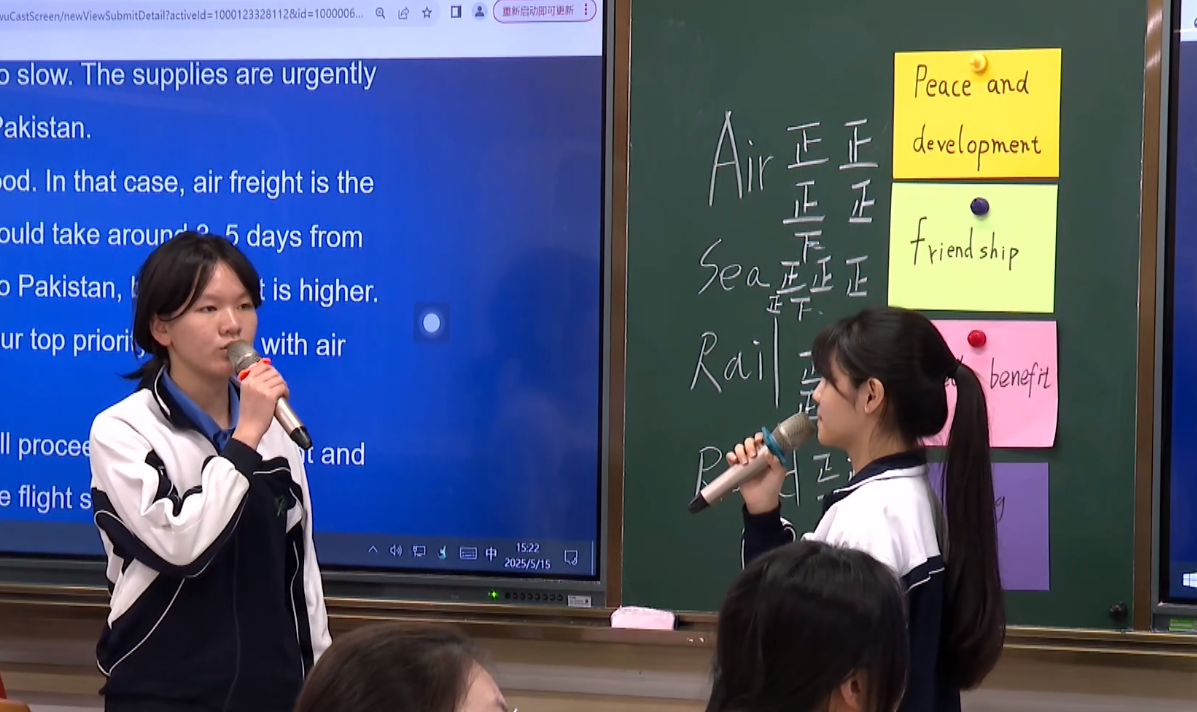 本次课第一个亮点就是科技点亮课堂——课程首创数字人带练导师带领学生朗读单词,为教师节省时间去观察学生的发音和口型是否正确;通过自主研发的AI语音测评系统帮助学生智能跟读、实时纠音,强化专业表达;设置智能游戏闯关环节,用智能词汇闯关游戏激发学生浓厚的学习兴趣,帮助学生在趣味游戏中掌握运输词汇。其次,指导学生使用课堂学习的词汇和句型进行辩论活动,海运、空运、公路、铁路四组学生化身国际物流辩手,用英语battle运输方式优劣,真正做到学以致用。同时,让学生化身“国际物流专员”,用英语与“海外客户”协商疫苗运输方案(结合中国疫苗援外真实案例),演练沟通过程,通过真实的模拟环境,让学生沉浸其中。除此之外,本次课通过“疫苗运输”案例研讨,引导学生思考“一带一路”内涵,激发“中国物流人”的民族自豪感、职业自信心和全球担当,真正做到了让思政无声润入课堂。