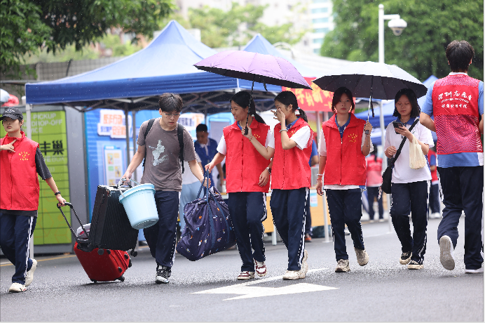 返校当日,各二级学院班主任及各职能部门迎新工作人员早早就守候在岗,在雨中热情引导学生及家长,协助大家顺利入校;志愿者们穿着统一服装,冒雨穿梭在人群中,主动接过学生手中沉重的行李,撑着伞护送他们前往报到点和宿舍,遇到学生询问路线或手续办理问题,志愿者们热情耐心地细致解答,用有爱的行动消除新生的忐忑和家长的不舍。在报到流程上,学校依托信息化手段简化手续,学生通过人脸识别即可完成信息核验,高效的服务让返校过程更顺畅,不少学生和家长纷纷为这份“雨中暖意”点赞。