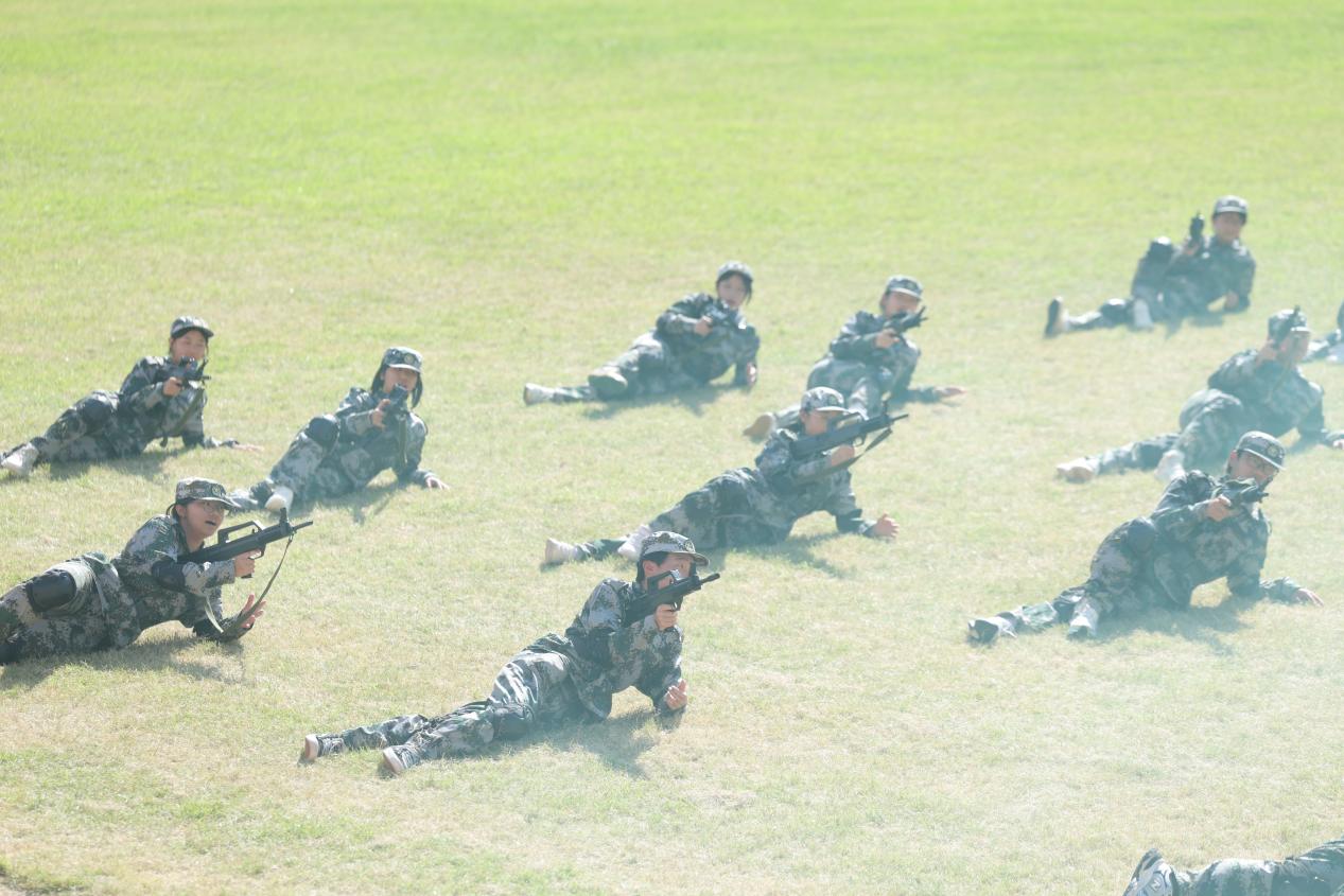 两校区新生的汇演点燃现场。伴随着激昂的进行曲,队列方阵步伐铿锵、横竖成线,展现出7天训练的扎实成果;拳术匕首操展演中,学子们出拳有力、劈刺精准,呐喊声响彻操场;战术动作展示环节,模拟战场环境下的匍匐前进、战术掩护一气呵成,尽显“小战士”的果敢姿态。