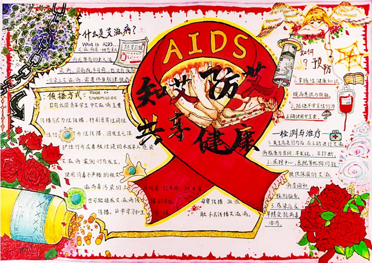 除线下沉浸式宣教外,学校以“以赛促学、以创践知”深化防艾教育实效,组织学生参与省、市两级2025年防艾主题创作比赛,多件作品脱颖而出:省级赛事中,微视频《暗夜重生》(作者:陈瑞婷、于翔、陈丹娜;指导老师:丁雷、张荣)、《艾启心扉》(作者:梁国圳、范俊杰、孙文敏;指导老师:李欣)凭借故事化表达传递正向理念,手抄报《知艾防艾,共享健康》(作者:黄雪柔;指导老师:何华)、《艾可防,爱无界》(作者:徐萱月;指导老师:殷紫瑜)以图文形式拆解防护要点,宣传海报《青春有爱,健康无艾》(作者:刘宇昕;指导老师:张荣)用视觉语言凝练健康主张,均荣获优秀奖;市级赛事里,《为爱发声青春无惧》(作者:李磊,指导老师:李熊)及《防艾必修课》(作者:林思婷、黄彬)斩获三等奖。这些作品既是学生对防艾主题的深度诠释,亦是校园内流动的科普阵地。