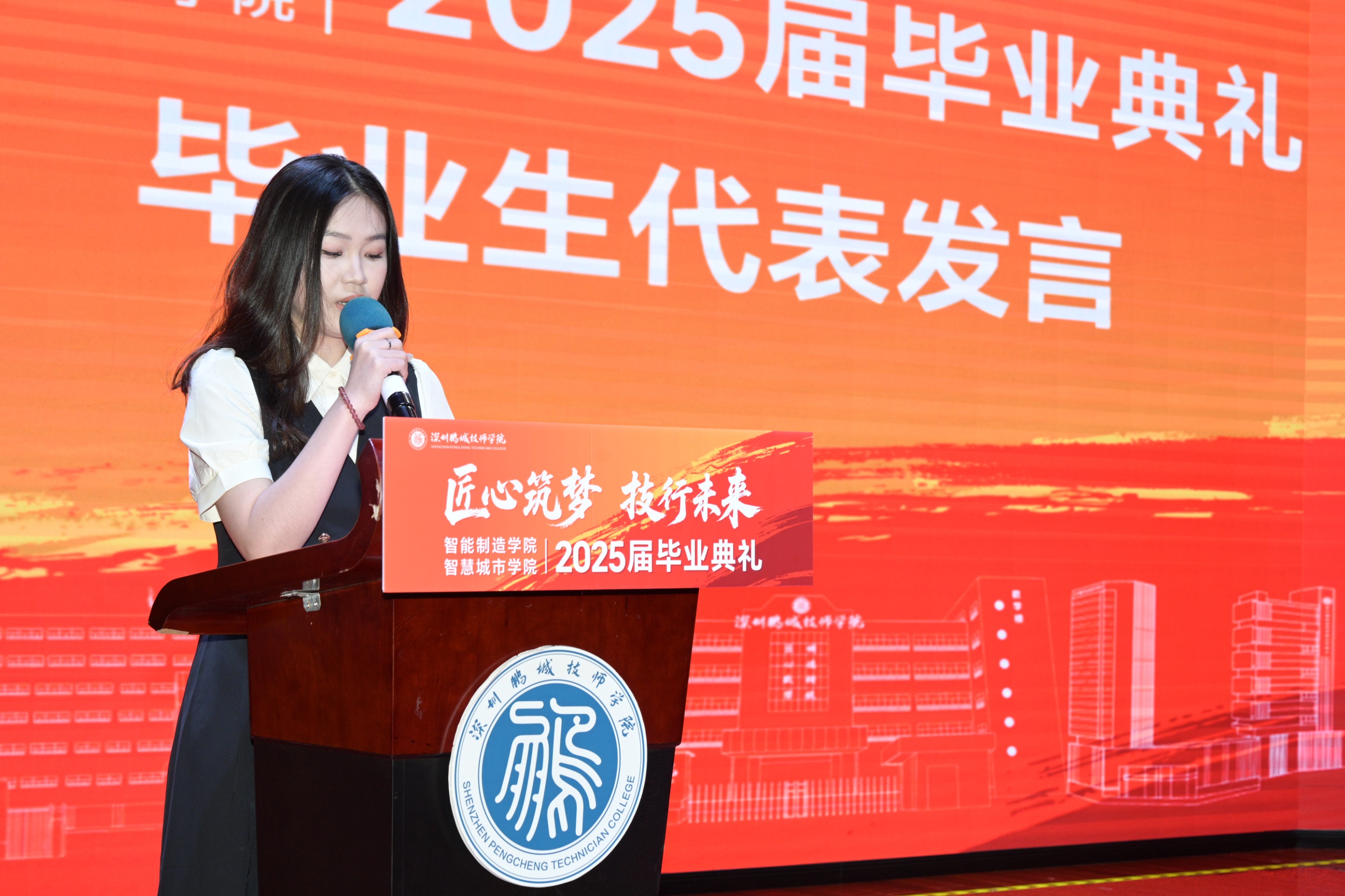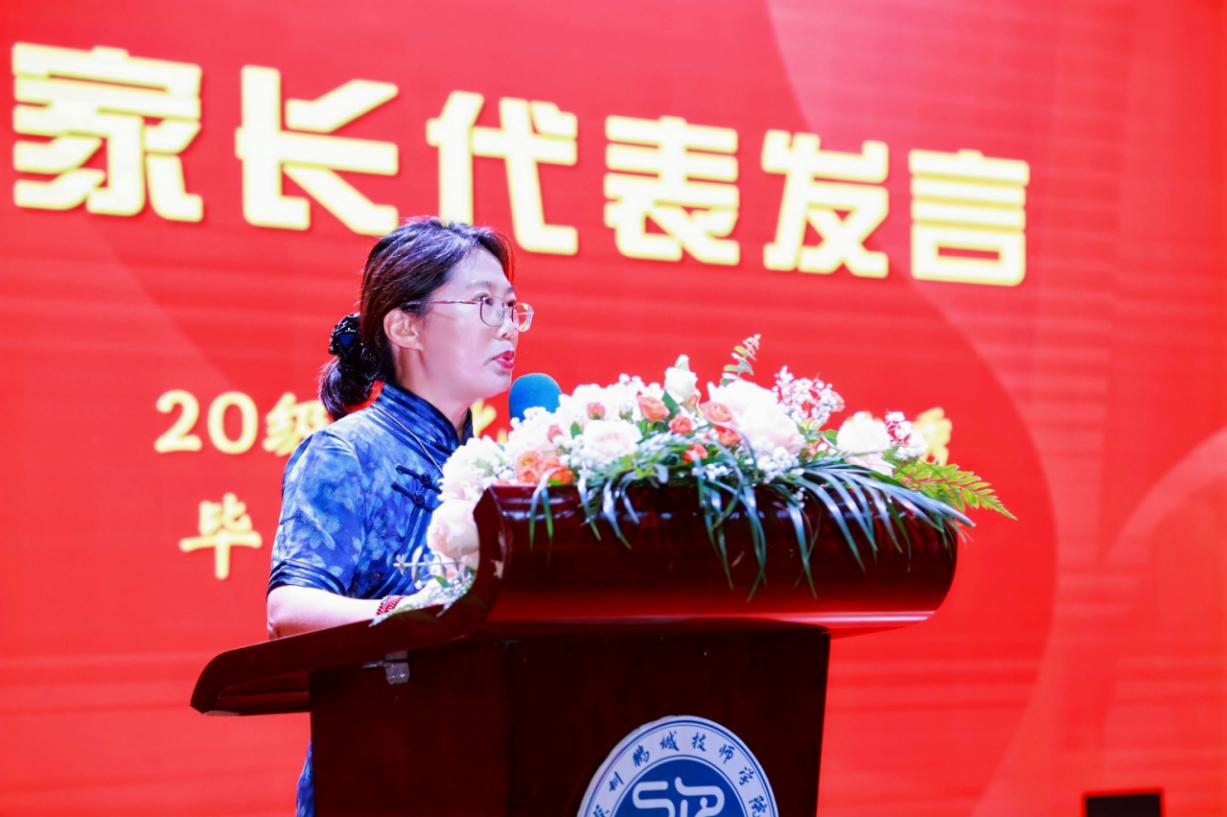20新能源汽车检测维修G5班彭渝淞父亲、20文化传播G5班王嘉瑞母亲等家长代表致谢说到“感谢学校让孩子们明白:技能报国不分赛道,匠心坚守即是光芒。”“这几年孩子捧回的虽非名校文凭,却收获了比证书更珍贵的成长——懂得责任、学会担当,这正是深圳鹏城技师学院给予孩子们最厚重的毕业礼物。”......这些感谢中,藏着对仵博院长寄语的认同,更是对学校“技能育人 技能成才 技能报国”育人模式的肯定。