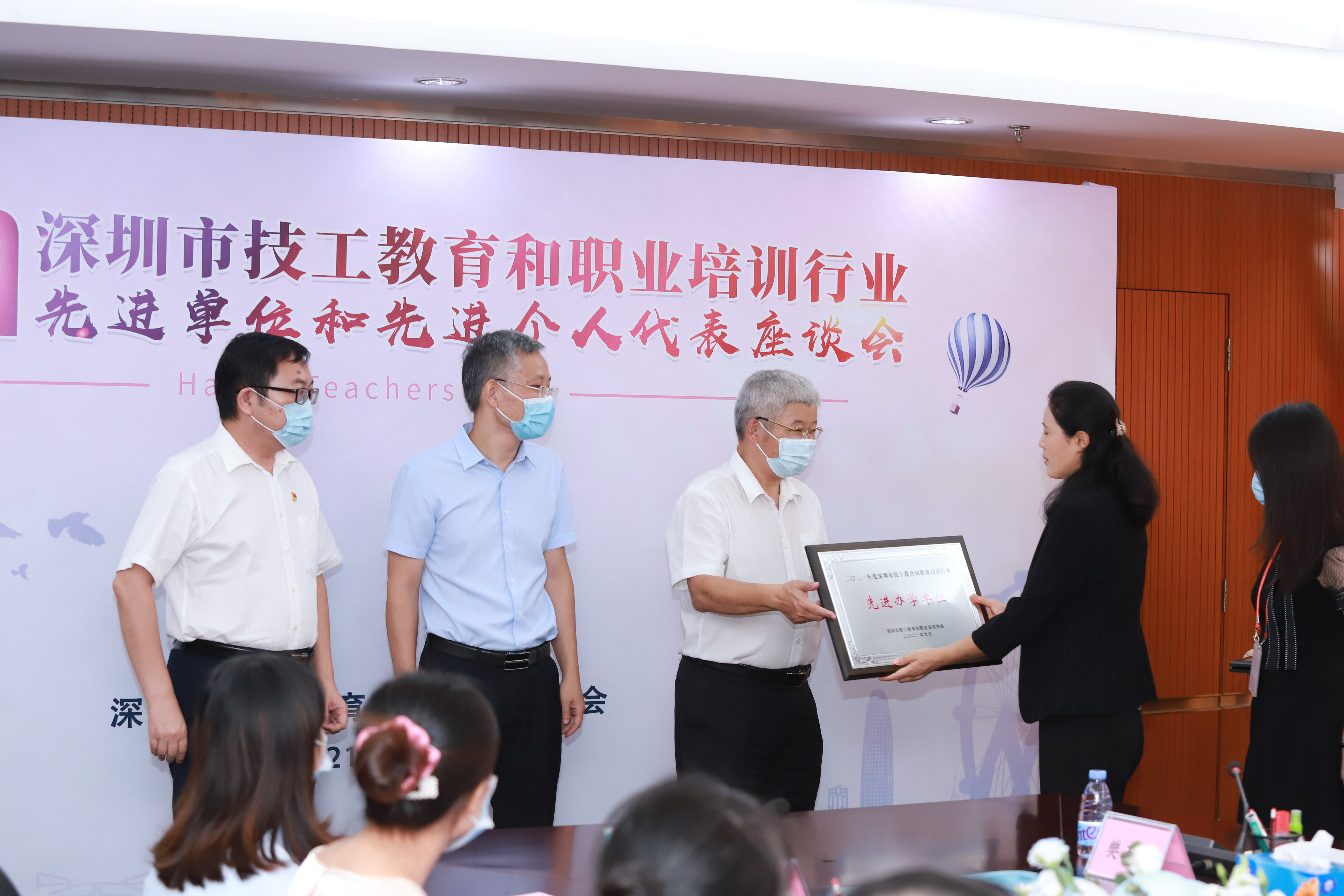教师节前夕,深圳市职工教育和职业培训协会组织了专题座谈会,深圳市人力资源和社会保障局党组成员、副局长高东春同志为先进单位和优秀个人代表颁奖。会上,我校党委书记、校长刘颖同志代表学校在教学改革创新、教学质量提升和技能人才培养等方面介绍了经验和体会。