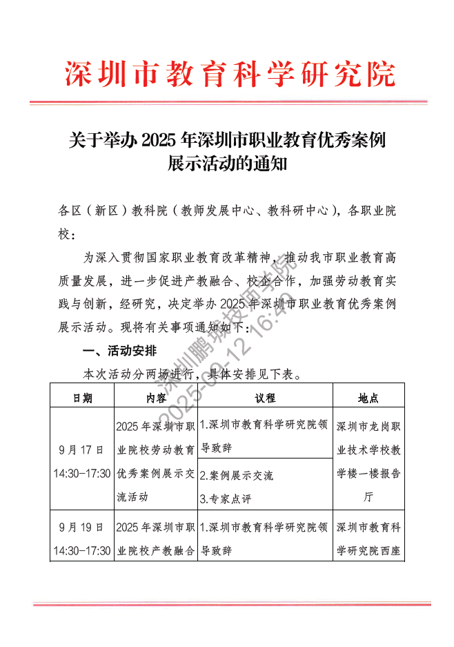 为深入贯彻落实习近平总书记关于职业教育的重要指示批示精神,进一步推动职业院校劳动教育的深入开展,总结和推广劳动教育方面的成功经验和创新做法,深圳市教育科学研究院于2025年3月至7月组织开展2025年深圳市职业院校劳动教育典型案例申报及评审工作。