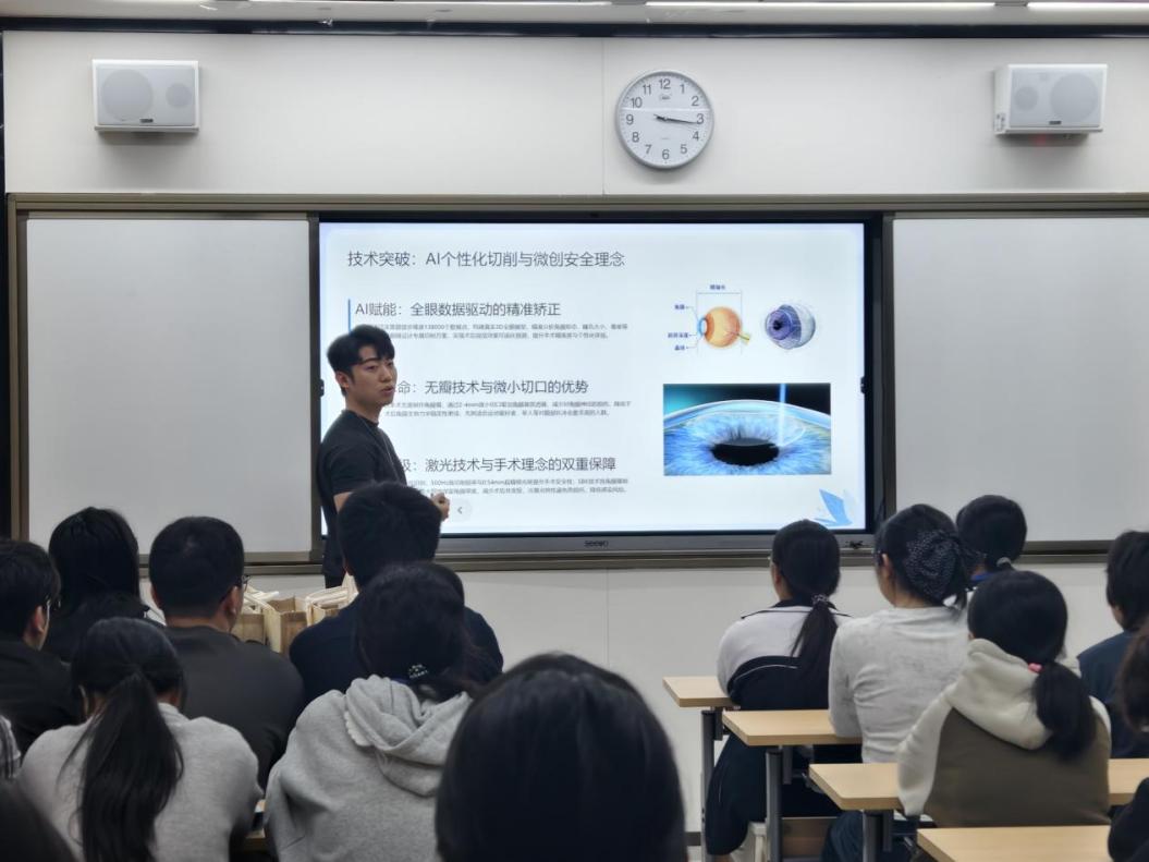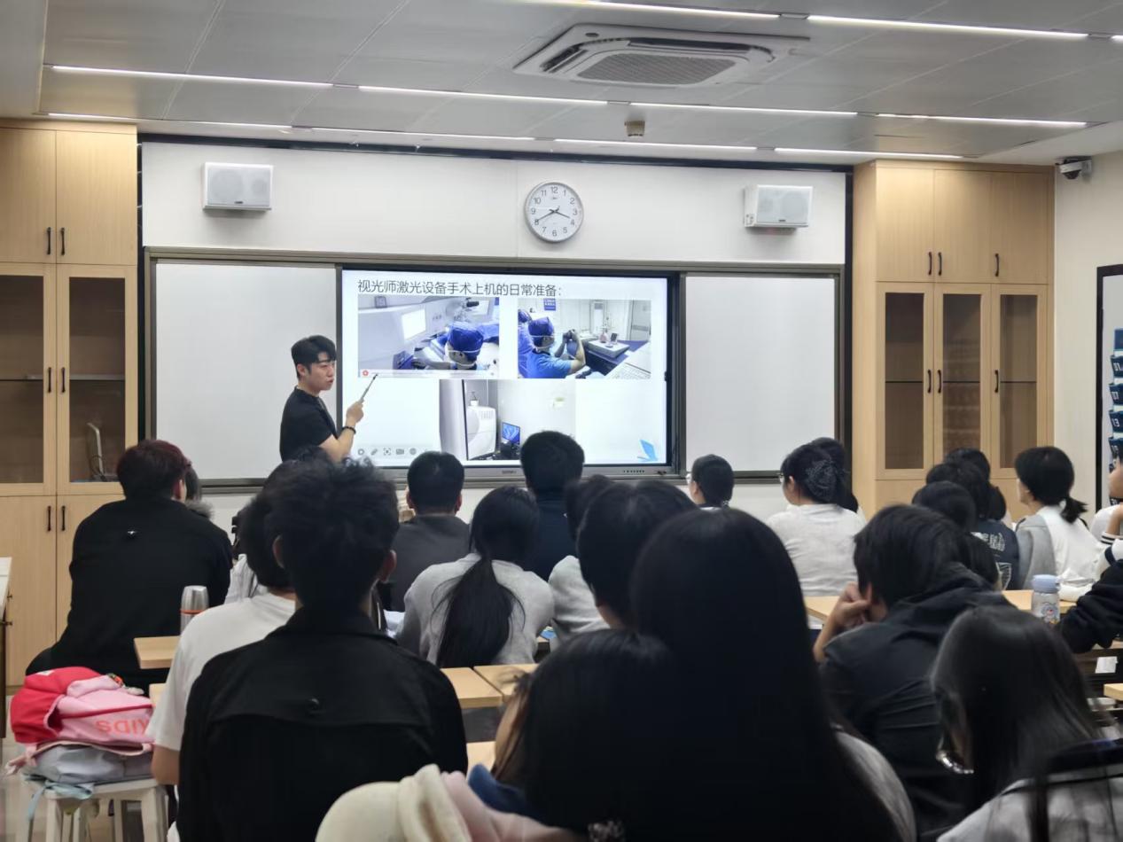 现任深圳希玛林顺潮眼科医院屈光经营主任的李涛,凭借扎实的专业功底、丰富的行业实践经验,在讲座中围绕屈光手术领域的前沿技术、行业发展趋势展开深度分享。他结合自身从校园走向职场的成长全轨迹,细致讲述了眼视光专业知识在屈光手术临床运营、患者沟通、技术服务等工作中的实际应用,强调扎实的技能功底是职业发展的基石,而持续学习、精益求精的自我修养,则是从“技能人才”迈向“行业骨干”的关键内核。
