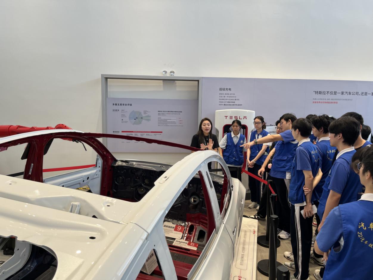 最受期待的“GIGA博物馆参访”环节,成为研学之旅的核心亮点。借助动态模型与实景还原,学生们直观看到特斯拉汽车从冲压、焊接、涂装到总装的全生产流程——从车身零部件的精准拼接,到电池包的集成安装,每一个环节都与课堂《汽车制造工艺》知识点紧密呼应。紧接着的“白车身专业讲解”环节,讲师针对车身结构强度、碰撞安全设计、模块化平台优势逐一拆解说明,学生们围在白车身模型旁,触摸车身焊点、观察车架结构,将课本中抽象的“车身力学”知识转化为具象认知。不少学生边看边用笔记本记录细节,还不时向讲师抛出“车身轻量化材料的选择标准”“电池热管理系统的实际应用”等专业问题,互动氛围热烈。